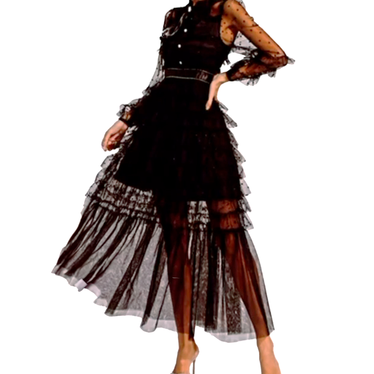 Discover unparalleled elegance with our long lace dress! This stunning dress combines exquisite polka dot lace with delicate traditional lace, creating a masterpiece of fashion. With its black background and matching lining, this dress is simply spectacular. Whether for a special occasion or just to stand out at any event, this dress will make you shine with style and sophistication. Immerse yourself in the beauty of this unique design and make an unforgettable fashion statement. Additionally, it exudes supreme romance and superchic elegance.