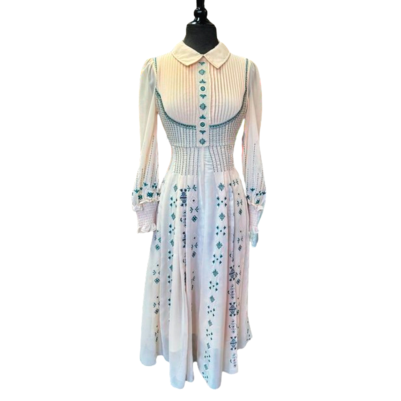 This beautiful midi dress is supremely conservative and classic, giving you a timeless 60s look. It exudes Chanel-style sophistication with its pleats at the front, closed with a chic collar. Adorned with front detailing, it cinches at the waist beautifully, flowing into a wide, graceful skirt that falls below the knees. Complete with long sleeves, it features another exquisite detail at the wrists, adding to its absolute chic and beauty.