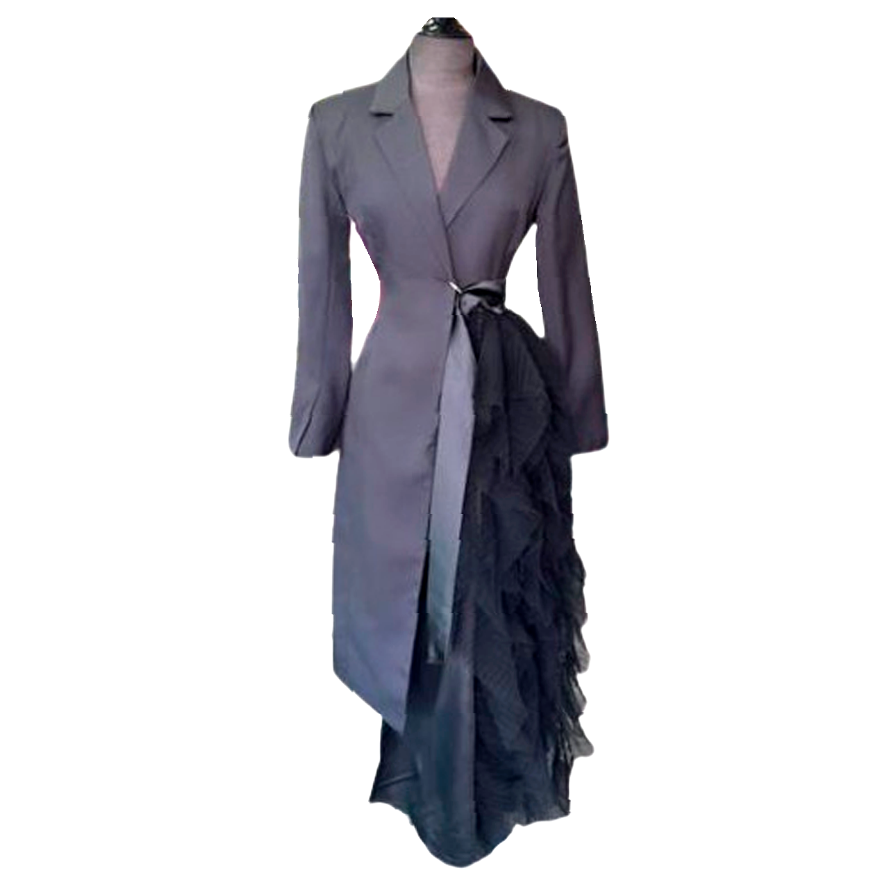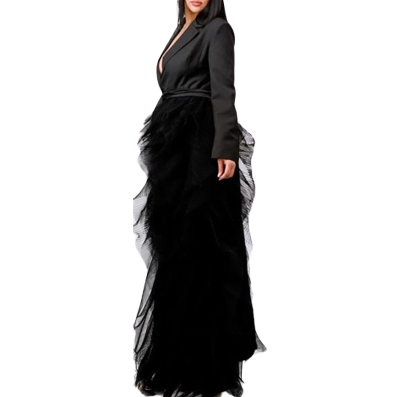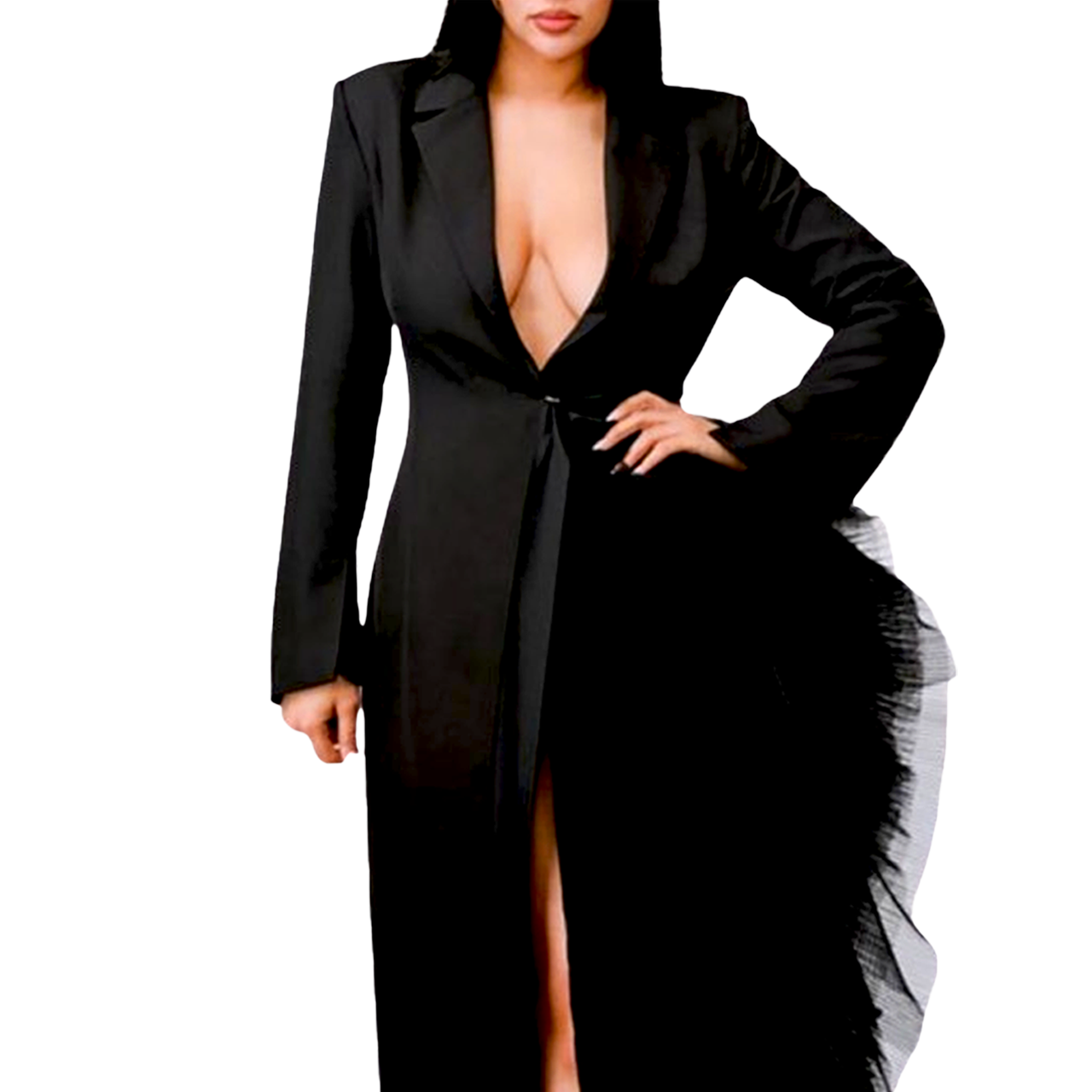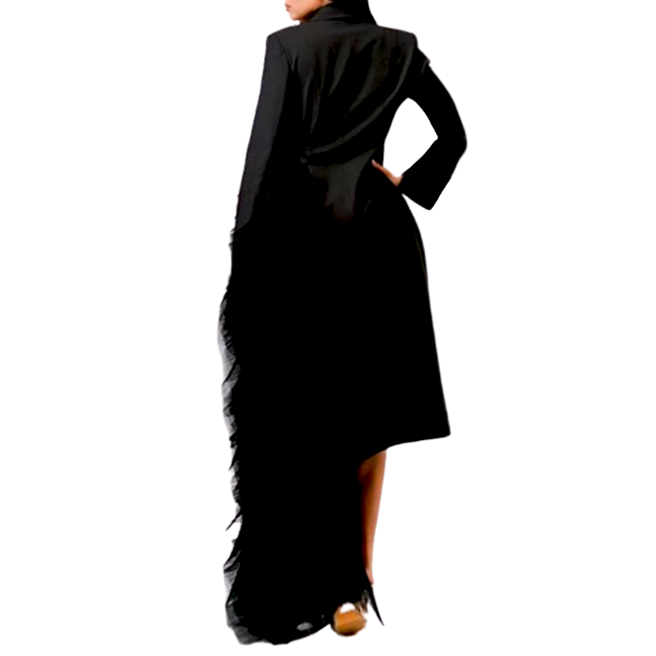 Introducing our stunning Black Blazer Set, perfect for any special occasion. This set includes a chic blazer with matching pants, designed to turn heads. The blazer features a unique, beautiful tull on the side, adding a touch of elegance. It flows in a cascade style all the way to the floor, creating a sophisticated and sexy look. This gorgeous ensemble is ideal for making a statement at any event.