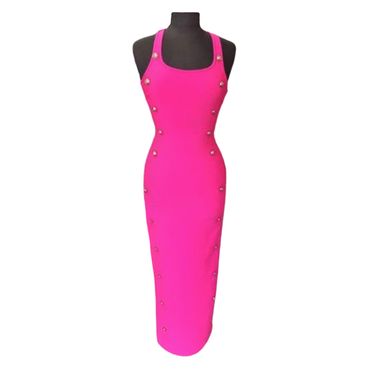 Behold our magenta midi dress: a sleek, body-hugging silhouette with a sleeveless back, exuding sheer elegance and allure.