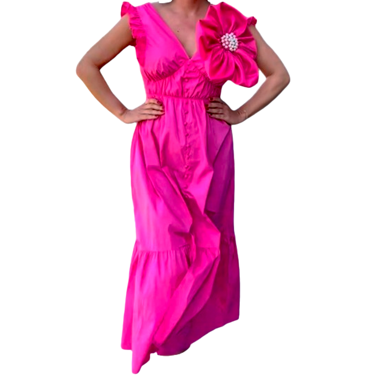 Shine bright this summer with our exuberant dresses! From vibrant green to bold fuchsia and classic navy blue, our collection has the perfect tone for you. Each dress is adorned with a beautiful lush flower and delicate pearls, making each piece even more spectacular!