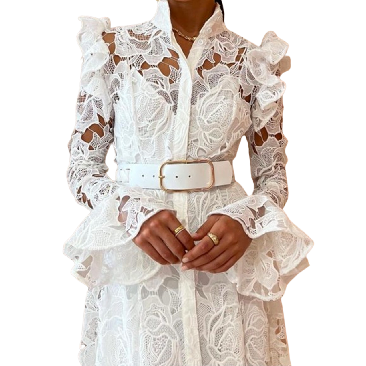 Step into elegance with this breathtaking white long dress. Crafted to perfection, it boasts long sleeves and delicate ruffles adorning the shoulders, adding a touch of grace. The focal point is its exquisite belt cinching the waist, accentuating your silhouette with timeless elegance. Underneath, a soft lining ensures a flawless fit, making this dress not just beautiful but absolutely stunning. Perfect for any occasion where you want to shine with effortless sophistication.