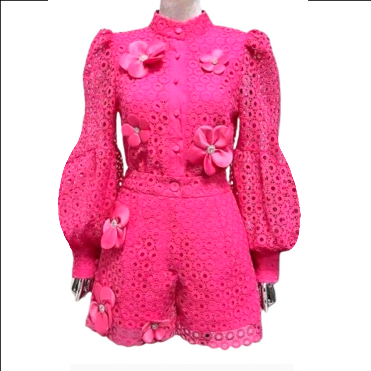 Picture a stunning, short set, perfect for spring and summer. It is vibrant with shades of pink, including a captivating hot pink hue. Delicate flowers adorn the fabric, adding a touch of natural beauty. This ensemble is absolutely gorgeous. Embodying the essence of the season with its fresh and lively design.