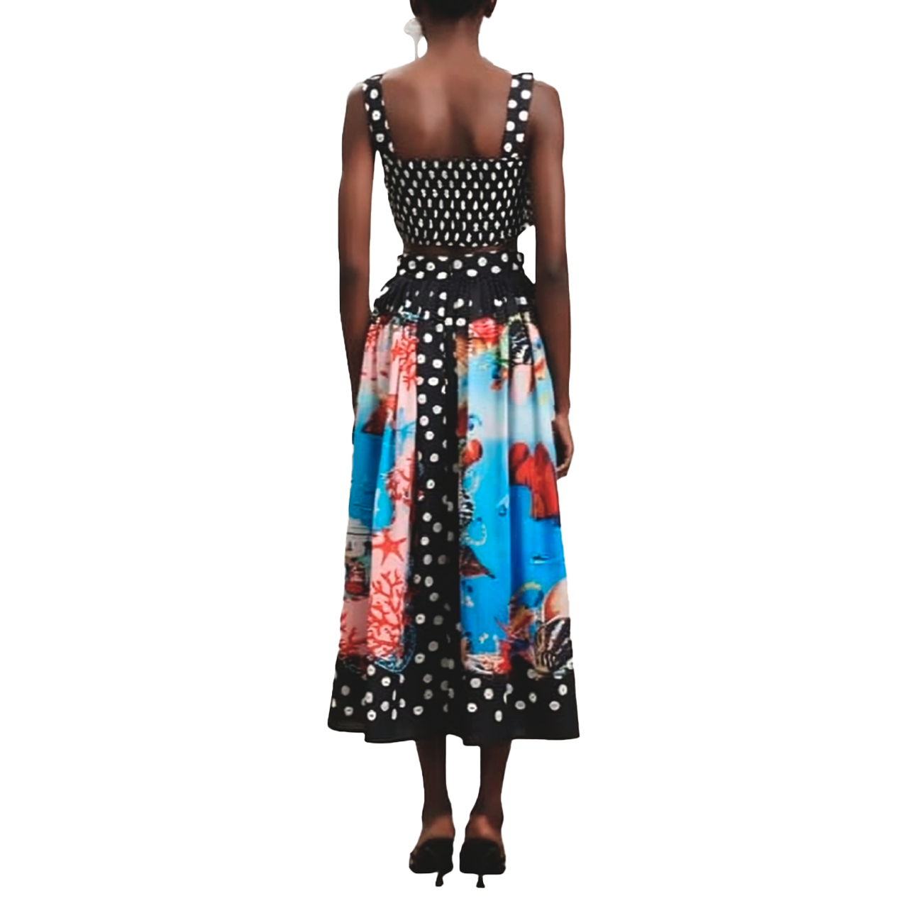 Turn heads this season with our effortlessly elegant two-piece ensemble. Featuring a stylish crop top adorned with playful polka dots, this set pairs perfectly with a flowing A-line skirt that combines classic polka dots with vibrant, artistic prints. The flattering A-cut skirt adds movement and charm, making it the perfect look for sunny days, brunch dates, or seaside strolls. Fresh, fun, and undeniably beautiful—your ultimate summer go-to.