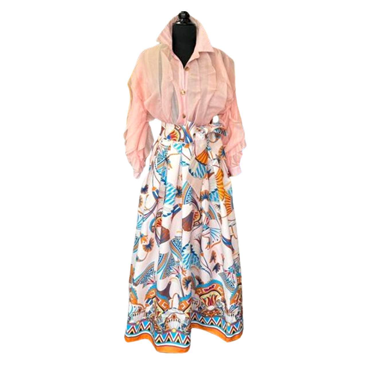 Découvrez notre sublime ensemble deux pièces, conçu pour captiver et enchanter. Cet ensemble se compose d'un superbe chemisier en soie couleur pêche, parfaitement confectionné pour une sensation luxueuse sur la peau. Son éclat délicat et son drapé élégant en font une pièce polyvalente pour toute garde-robe sophistiquée. Il est complété par une jupe longue en soie à couper le souffle, ornée d'un imprimé envoûtant qui respire l'élégance et le charme.