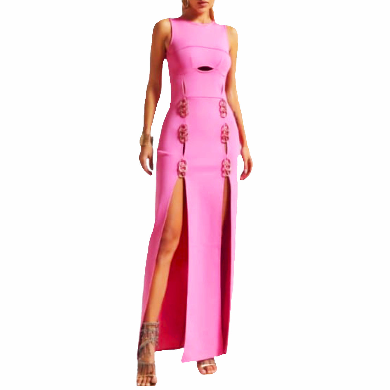 Este impresionante vestido rosa está diseñado para causar sensación. Con doble abertura en las piernas que le da un toque de encanto de pies a cabeza, es la combinación perfecta de elegancia y sofisticación. Su silueta ajustada sin mangas realza tus curvas, convirtiéndolo en una prenda inolvidable para cualquier ocasión especial.