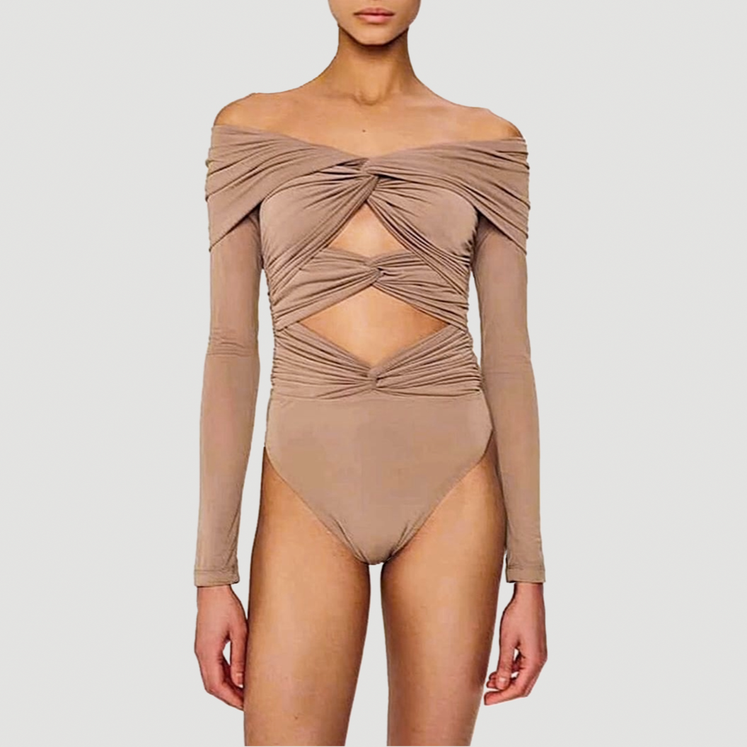 Acapara todas las miradas con este impresionante body cruzado, diseñado para realzar tus curvas con una elegancia audaz. Con un frente abierto y detalles de cortes llamativos, esta prenda está confeccionada en malla transparente que se adapta al cuerpo en los puntos clave. El intrincado diseño cruzado añade un toque vanguardista a la vez que mantiene un estilo sensual y sofisticado. Disponible en dos preciosos tonos: verde oliva terroso y beige suave y sensual, este body es perfecto para destacar, ya sea en capas o en solitario.